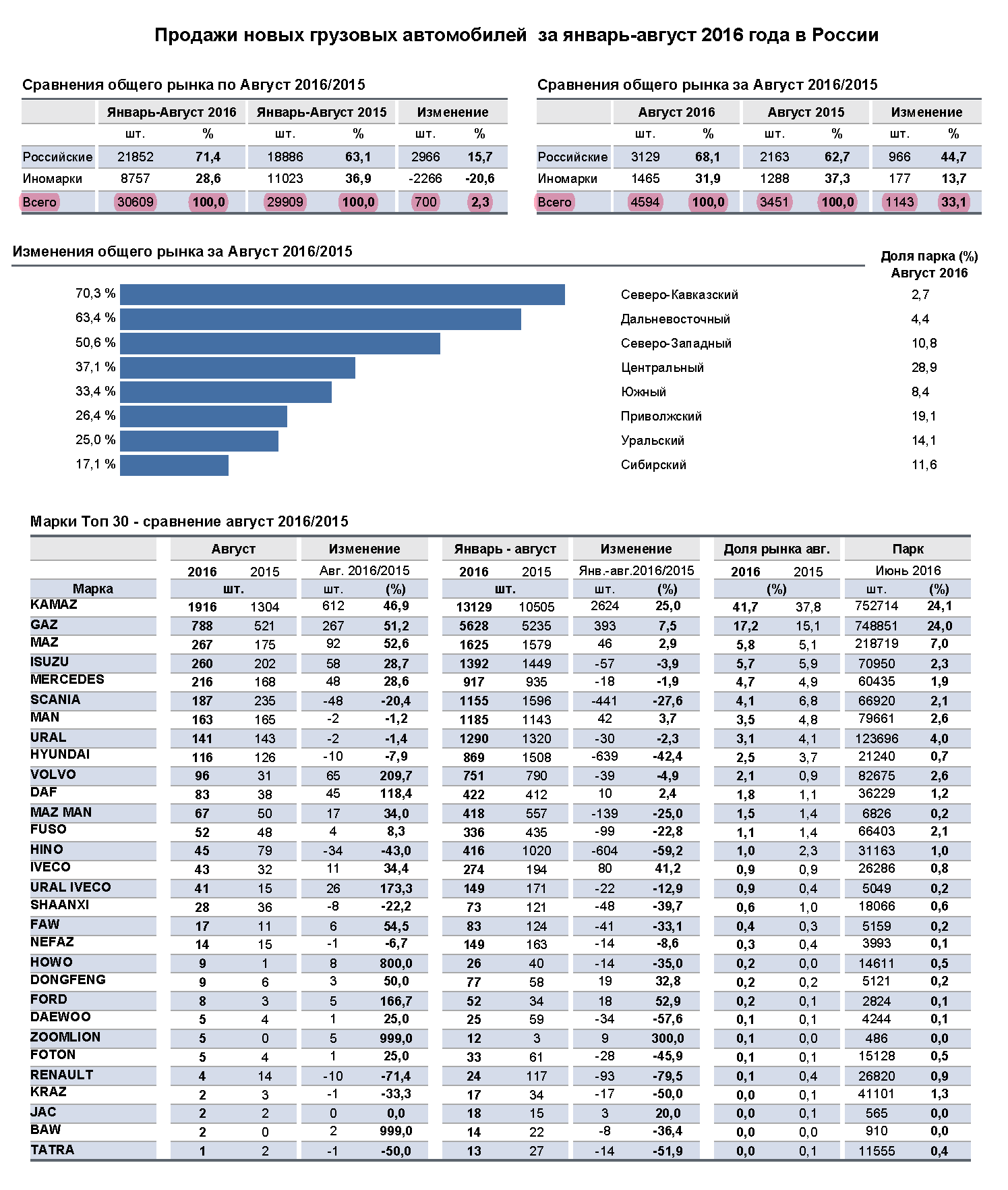 Лидер грузового рынка РФ, марка «КАМАЗ», продала в августе 1916 ед. техники, на 47% больше, чем за аналогичный период прошлого года. За январь-август объемы реализации грузовых «КАМАЗов» выросли на 25%, до 13 129 ед. авто. «ГАЗ» прочно занимает второе место по продажам грузовых машин в России с показателем 788 реализованных ед. техники в августе (+51,2%) и 5628 шт. (+7,5%) в январе-августе. На третье место в рейтинге грузового рынка — «МАЗ», который продал в прошлом месяцев в РФ 267 ед. техники (+52,6%), и реализовал за восемь месяцев нынешнего года 1625 грузовиков (+2,9%).