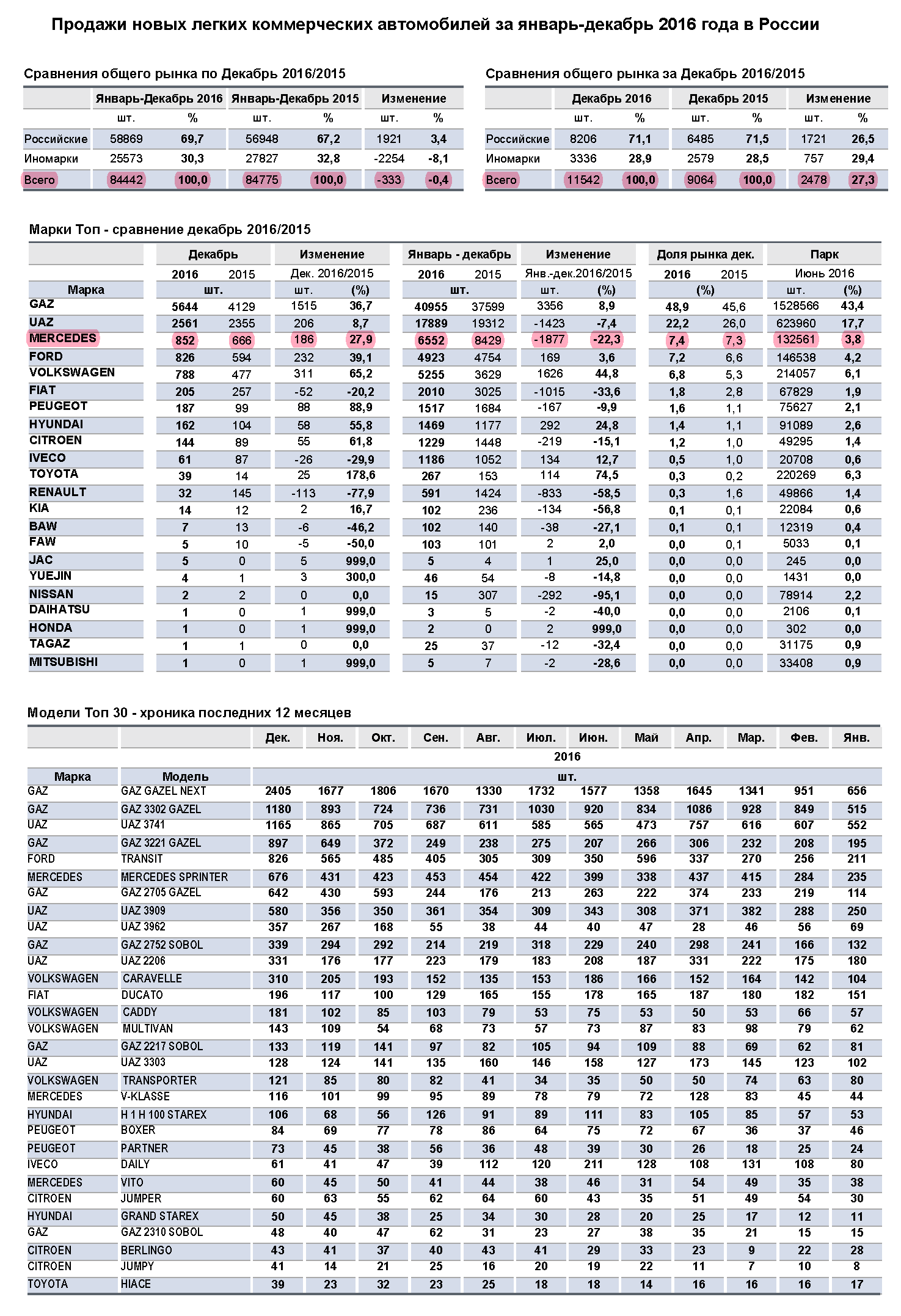 Отметим, что Mercedes-Benz Sprinter занял первое место среди моделей в сегменте LCV-иномарок в 2016 году. Всего было продано 4967 таких машин, на 23,4% меньше, чем годом ранее. На втором месте — Ford Transit, спрос на который за год вырос на 7% (продано 4915 ед.). А замыкает тройку лидеров среди моделей иномарок Volkswagen Caravelle — 2062 шт. (+73,4%).
