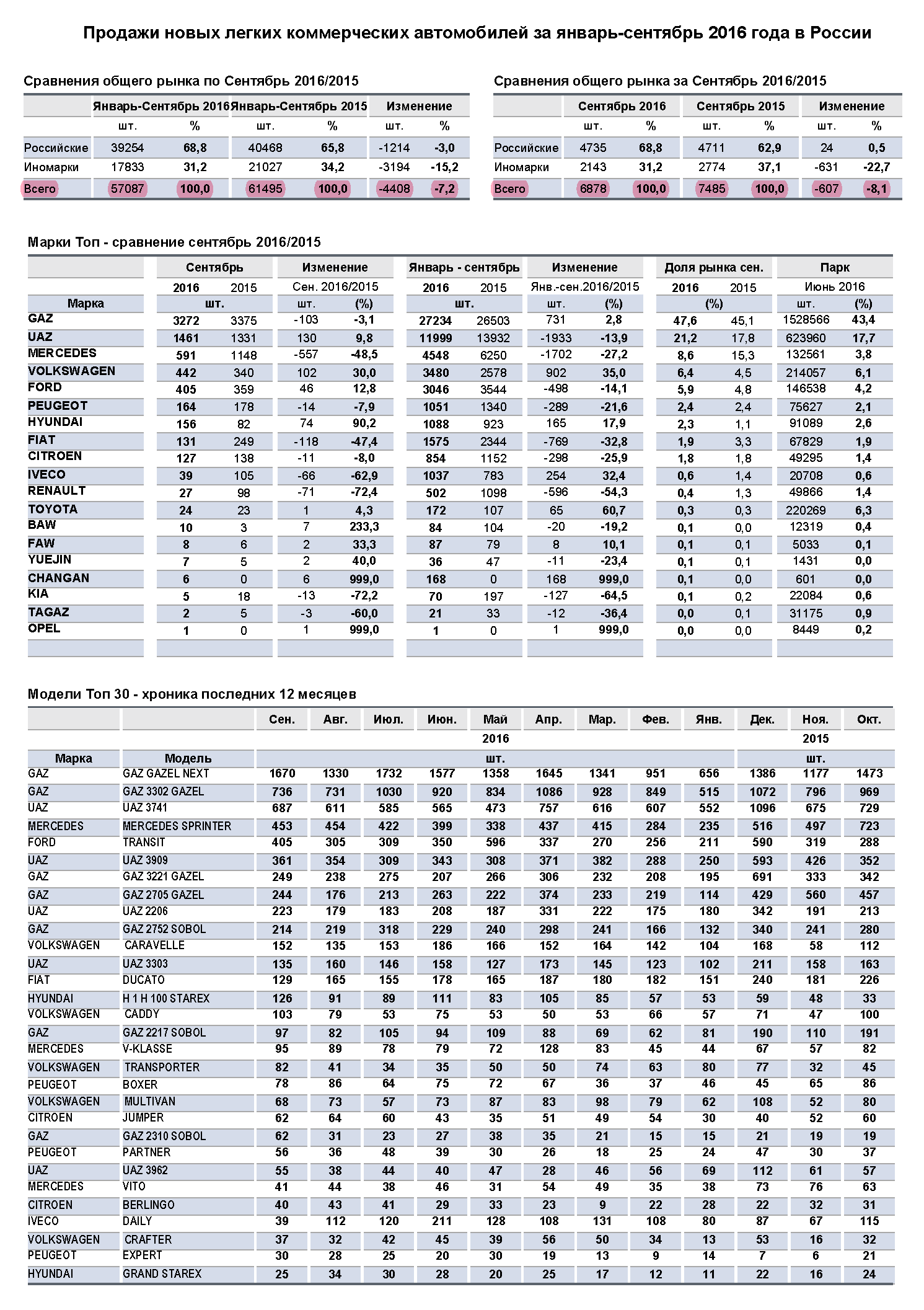 «Автостат Инфо» обнародовал результаты исследования рынка легких коммерческих автомобилей за первые три квартала 2016 года. Согласно данным исследования, за отчетный период продажи LCV в стране сократились на 7,2%, всего за январь-сентябрь было продано 57 087 ед. техники.