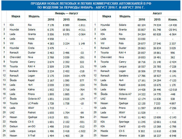 В топ-10 самых популярных автомобилей на российском рынке вошли девять моделей российского производства. Первое место в рейтинге занял Kia Rio. Всего за прошлый месяц было реализовано 7 178 корейских иномарок против 8 989 ед. годом ранее. На втором месте – Hyundai Solaris: в августе россияне приобрели 6 270 таких машины. В 2015 г. за аналогичный период было реализовано 10 581 единица. Таким образом, эта модель стала лидером по падению спроса за прошедший месяц