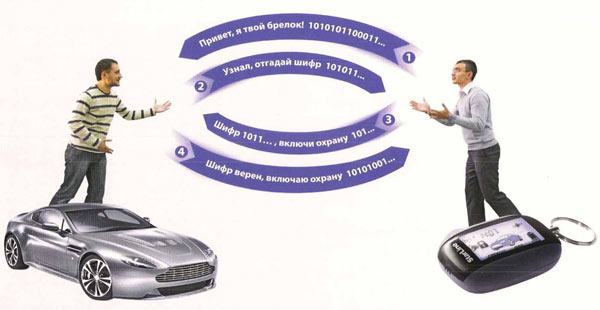 Проще говоря, с брелка системе посылается сигнал, получив который, она, в свою очередь, посылает на брелок запрос в виде случайного числа. Используя специальный алгоритм, брелок обрабатывает запрос и отсылается его обратно, а сигнализация, все по тому же алгоритму вновь его обрабатывает и сравнивает полученный результат с имеющимися данными. Сигнализация деактивируется только в том случае, если данные эти совпадают.